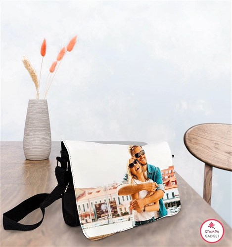 Borsa tracolla personalizzata media con due scomparti e due tasche con cerniera. Hai la possibilità di stampare su quasi tutta la superficie esterna una tua fotografia o immagine inserendo effetti grafici e testi. La pattella anteriore con la foto è intercambiabile. Puoi acquistare anche pattelle aggiuntive per cambiare l'immagine alla tua borsa Area di stampa 33 cm x 25 cm