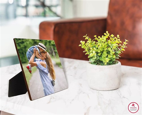 Da oggi le tue fotografie assumono importanza e vengono impreziosite e incastonate all’interno di una cornice in legno cromaluxe, personalizzata con la tua foto migliore. I tuoi momenti più significativi in compagnia dei tuoi cari o delle persone a cui ci tieni in particolar modo, puoi stamparli e personalizzarli secondo il tuo gusto e tenendo presente lo spazio che dovrai arredare. Con piedistallo per appoggiarla a qualsiasi superficie, in fase di creazione inserisci le proposte grafiche messe a tua disposizione e scrivi un testo con nomi, date, citazioni, auguri.. In fase di ordine scegli la maschera orizzontale o verticale a seconda della tua foto. formato 25 x 25 cm Area di stampa 25 x 25 cm